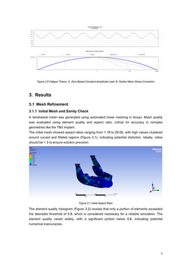 I simulated a Temporomandibular Joint (TMJ) implant under realistic jaw-loading conditions using Ansys. Titanium Ti-6Al-4V and Stainless Steel 316L were compared based on stress, fatigue life, and natural frequency.