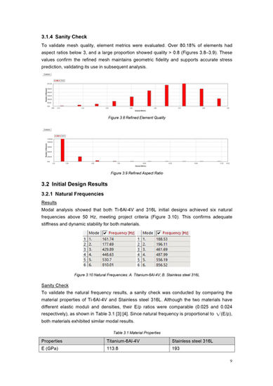 Based on the results, I redesigned the implant to reduce mass and improve performance. Final models showed >10-year lifespan and all natural frequencies above 50 Hz. Ti-6Al-4V was recommended due to its superior strength-to-weight ratio.